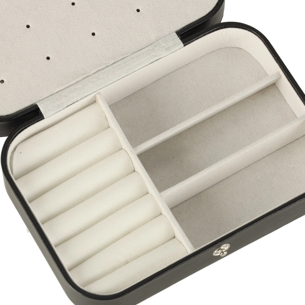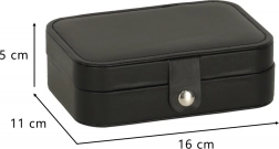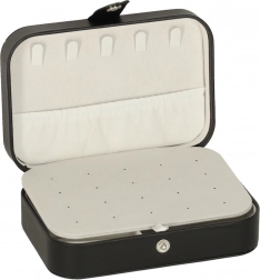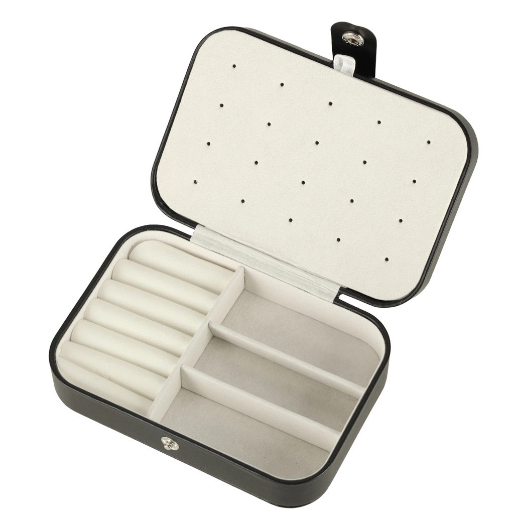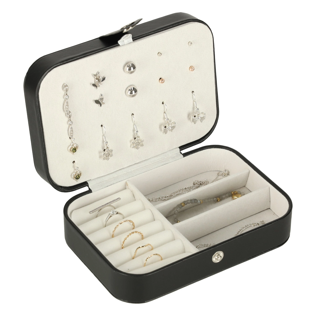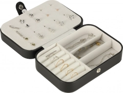 Elegantna putna kutija za nakit s promišljenim rasporedom za prstenje, naušnice, narukvice i ogrlice. Kompaktne dimenzije, sigurno kopčanje na druker i mekana podstava štite nakit kod kuće i na putu. Nudi 12 mjesta za prstenje, panel za 10 parova naušnica, pretince za sitnice i 5 kukica s džepićem za lančiće.
