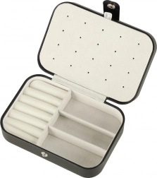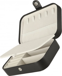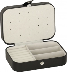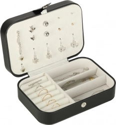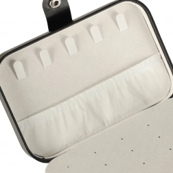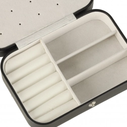 Unutra ćete naći dva glavna odjeljka odvojena pregradom, valjke za 12 prstenova, panel za 10 parova naušnica (na vijk), praktične podijeljene pretince za privjeske, perlice i sitnice te također 5 kukica s elastičnim džepićem za pregledno spremanje ogrlica bez zapetljavanja. Kopčanje na druker drži sadržaj sigurno zatvorenim tijekom prenošenja.