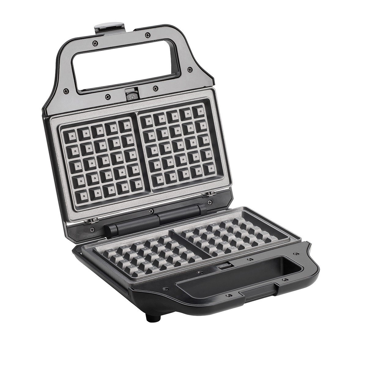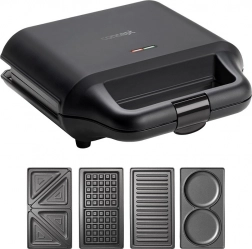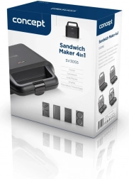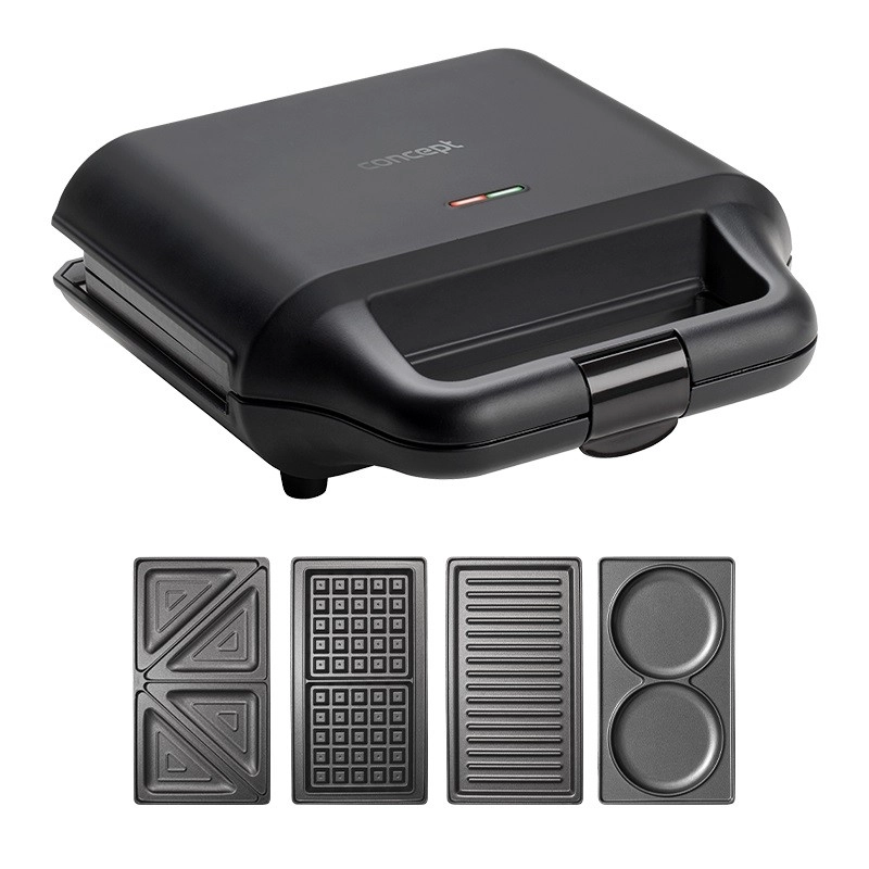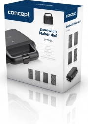 Toster za sendviče 4u1 u elegantnom crnom dizajnu brenda Concept praktičan je pomoćnik za brzu pripremu jela. Uz njegovu pomoć možete pripremiti: