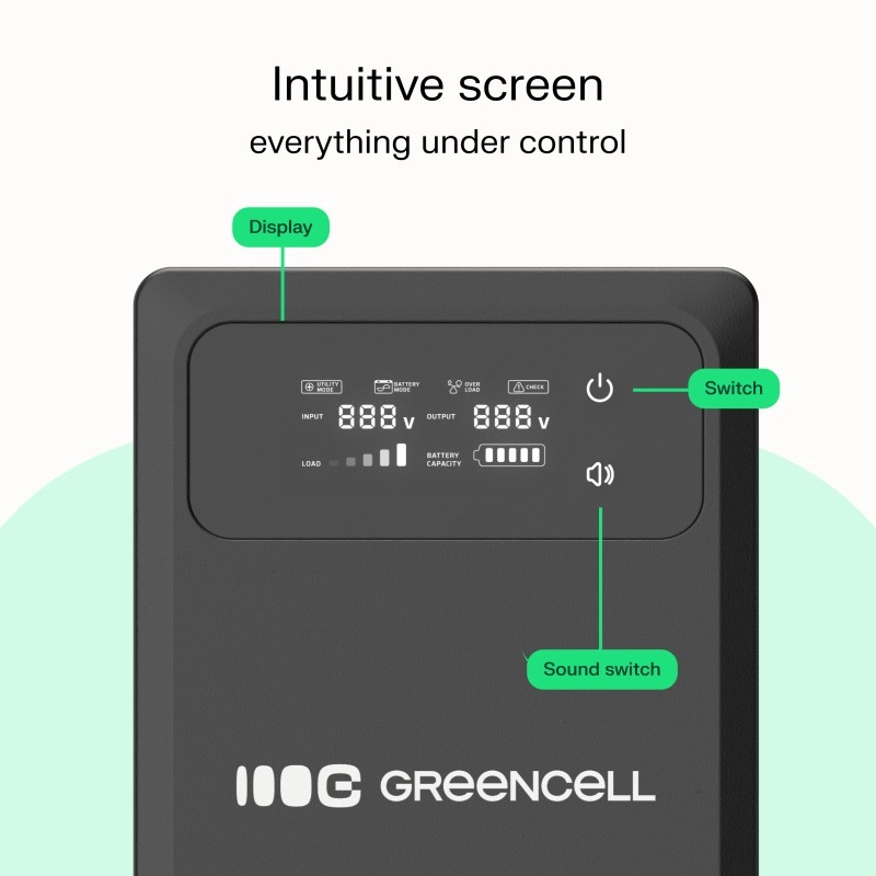 Uređaj ima čitljiv LCD zaslon koji informira o statusu i napunjenosti baterije. Fizički prekidač za utišavanje omogućuje brzo isključivanje zvučnog alarma, a zamjenjivi osigurač može se lako zamijeniti bez otvaranja kućišta.