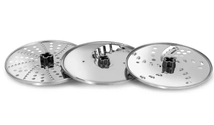 Paket uključuje 3 nehrđajuća diska. Disk za naribanje krumpira olakšava pripremu hrskavih palačinki, disk za trganje i rezanje na ploške idealan je za povrće i sireve, dok disk za rezanje na štapiće omogućuje brzo stvaranje oblikovanih pomfrita ili priloga za salate.