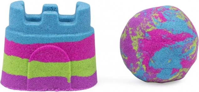 Varijanta Mini Dugin dvorac sadrži 140 g pijeska u četiri boje (plava, zelena, ljubičasta, ružičasta). Čašica u obliku dvorca poslužit će kao kalup za gradnju i kao praktično spremište – nakon igre pijesak jednostavno spremite unutra i spreman je za novo stvaranje.