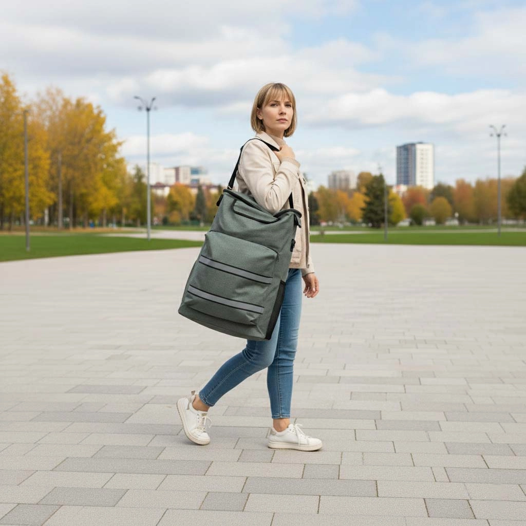 Zahvaljujući velikim kotačima i okretnoj ručki rukovanje je glatko i na neravnom terenu. Reflektirajuće trake povećavaju vidljivost u sumrak i mraku, pa vas ništa neće iznenaditi. Torbu je moguće lako skinuti sa stalka, što olakšava prenošenje i spremanje.