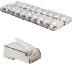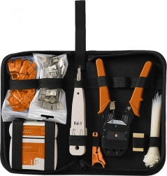 Set uključuje sve potrebne alate: krimplerice, odizolirivač, umetnik konektora, RJ45 konektore i omote, uključujući estetsku torbicu, što omogućuje početak rada odmah.
