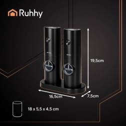 Električni mlinci za papar i sol marke RUHHY idealan su dodatak za sve koji cijene kvalitetu i estetiku. Univerzalna upotreba omogućuje njihovu uporabu za razne vrste začina, uključujući i bilje. Mljevenje osigurava keramički mehanizam koji je trajan i precizan bez metalnog okusa.