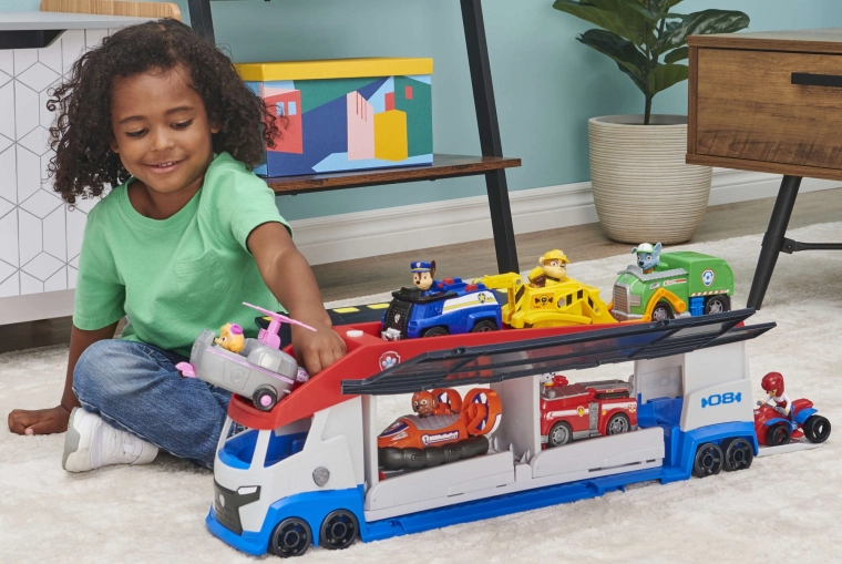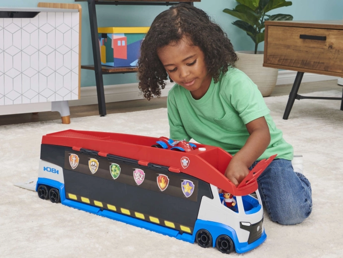 Ogromni transporter inspiriran omiljenom serijom PAW PATROL razveselit će sve male spasioce. Zahvaljujući preklopnim bočnim panelima i rampama, iz karoserije kamiona nastaje mobilni servis i zapovjedništvo. Pritiskom na gumb s otiskom šape oglašavaju se realistični zvukovi motora, trube i vožnje unatrag, koji još više pojačavaju atmosferu igre.