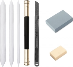 Sadrži 27 ručno odabranih alata uključujući olovke, ugljen i druge potrepštine potrebne za skiciranje.