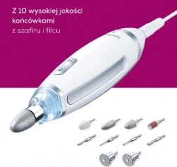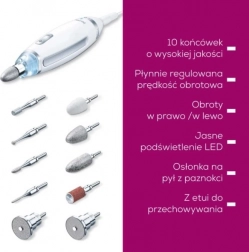 Set Beurer MP62 nudi bezstupanjsko podešavanje brusilice za nokte za manikuru i pedikuru s 10 nastavaka i zaštitom od prašine. Zahvaljujući svijetlom LED svjetlu osigurava preciznu i sigurnu upotrebu.