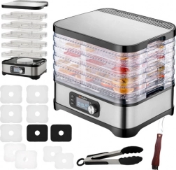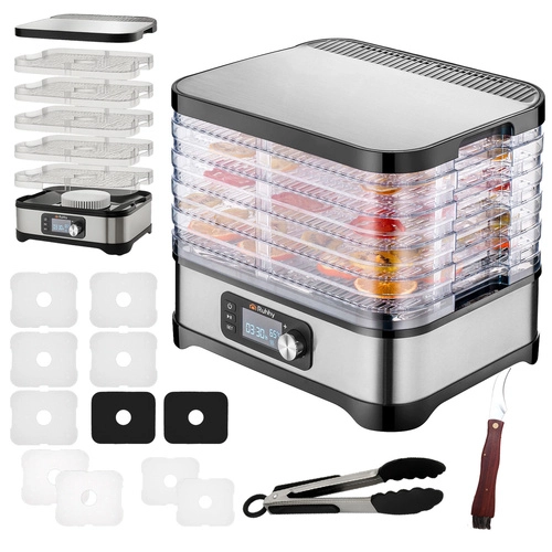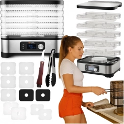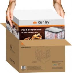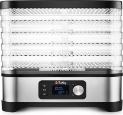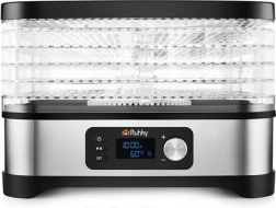 Univerzalna sušilica RUHHY s snagom 400 W idealna je za sušenje gljiva, voća, povrća i bilja. S 5 polica kapaciteta 10 litara, podesivom temperaturom (35–70°C) i LCD zaslonom s programatorom na 72 sata pruža učinkovito i energetski štedljivo sušenje.