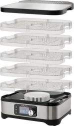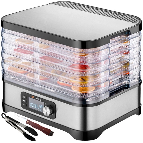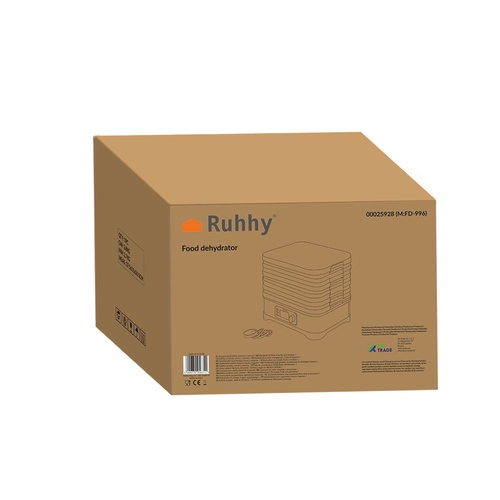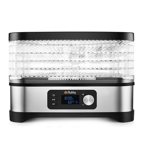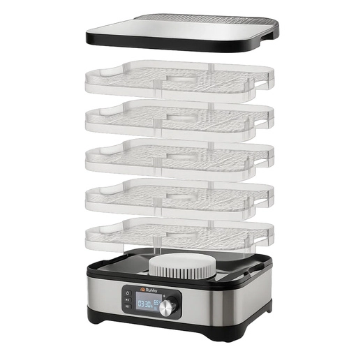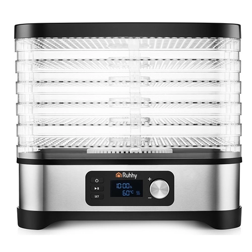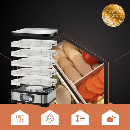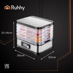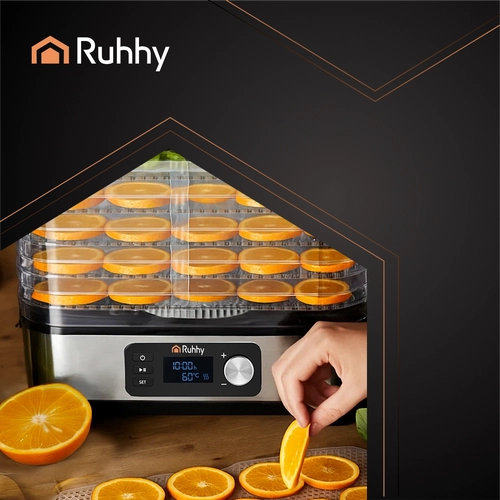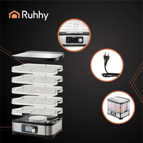 Sušilica RUHHY odlikuje se univerzalnom primjenom - idealna je za sušenje gljiva, voća, povrća i bilja. Ima 5 polica za maksimalan prostor za sušenje i podesivu temperaturu od 35 do 70°C za prilagodbu različitim vrstama hrane.