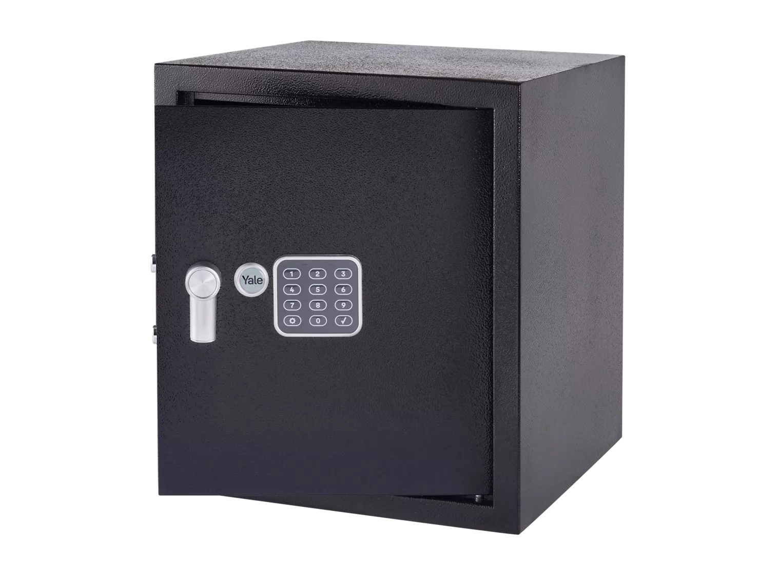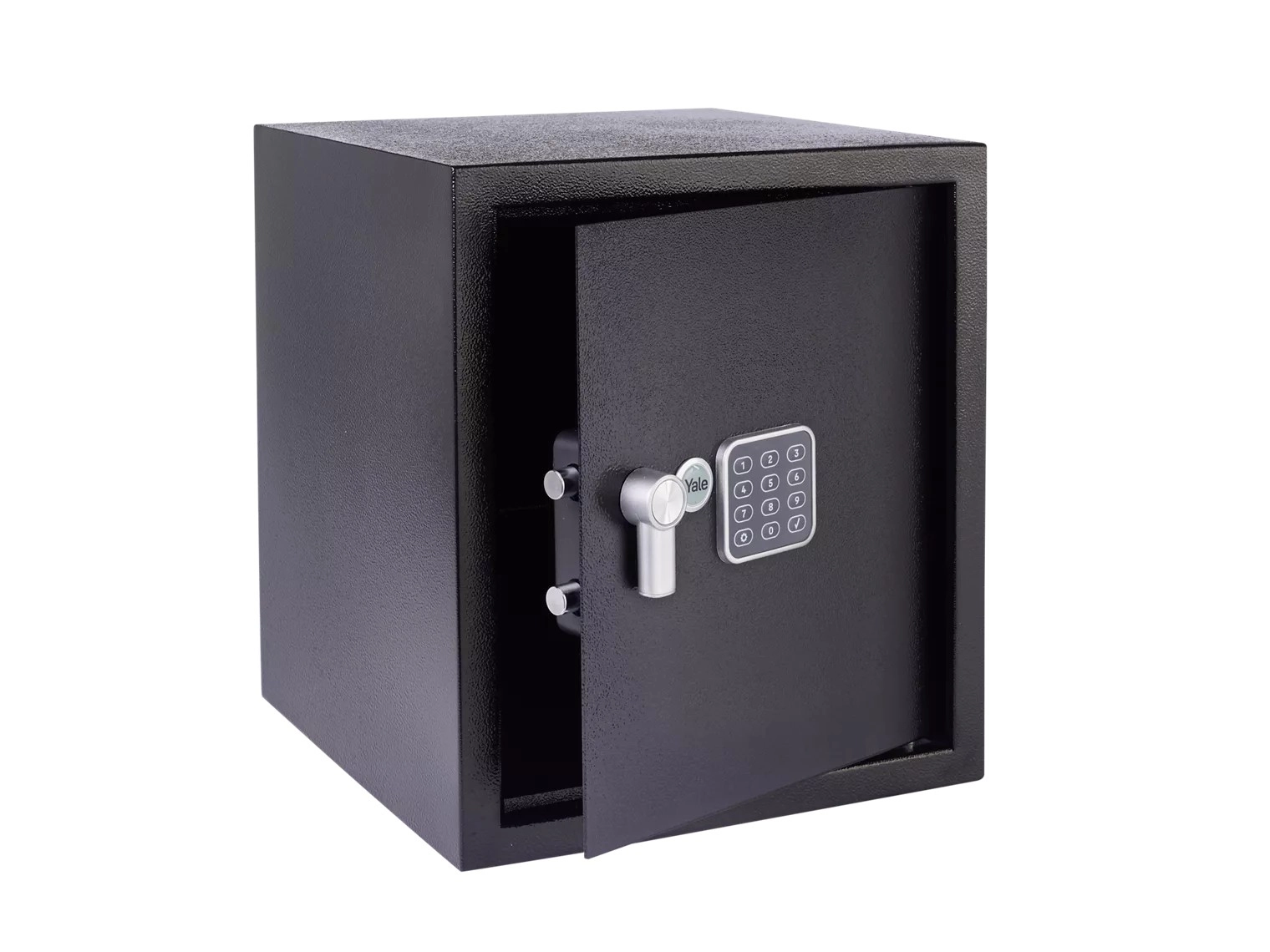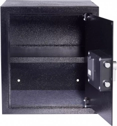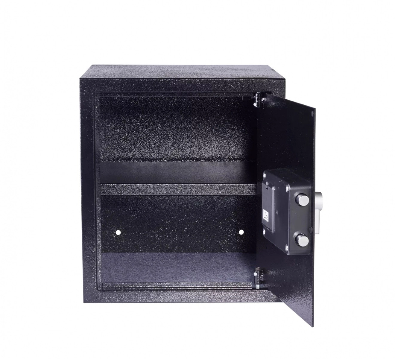 Sef je izrađen od izdržljivog čelika i isporučuje se s pripremljenim montažnim otvorima i ankerima za jednostavnu ugradnju. Uživajte u miru zahvaljujući vremenski ograničenoj blokadi koja se aktivira nakon tri neuspjela pokušaja unosa koda. Unutra ćete pronaći praktičnu unutarnju policu i koristan indikator niske razine baterije. U slučaju potrebe na raspolaganju su 2 komada mehaničkog ključa za hitno otvaranje.