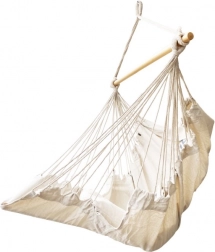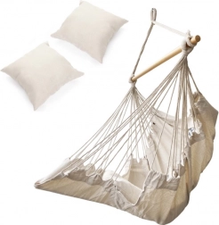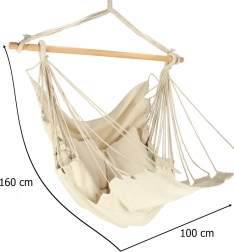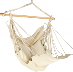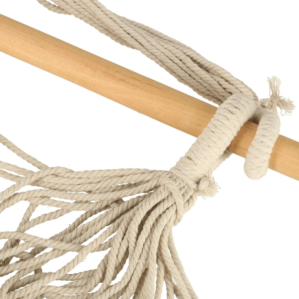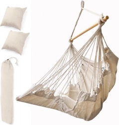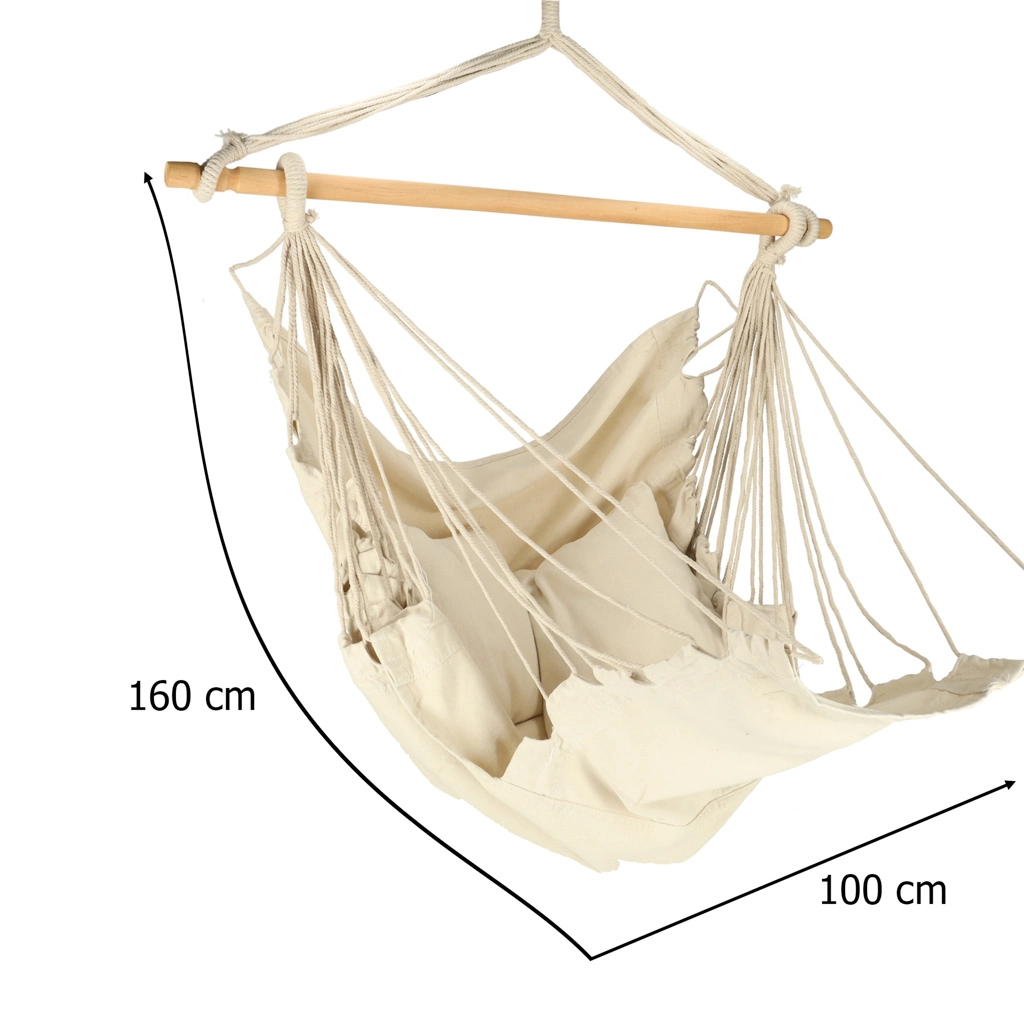 Ovaj viseći namještaj odgovara boho dizajnu i lako se može smjestiti u vrtu ili vikendici. Materijal je ugodan na dodir i pomaže ublažiti stres. Paket sadrži stolicu, drvenu šipku, viseće užad i dva udobna jastuka. Dodajte svom životu mir i udobnost.