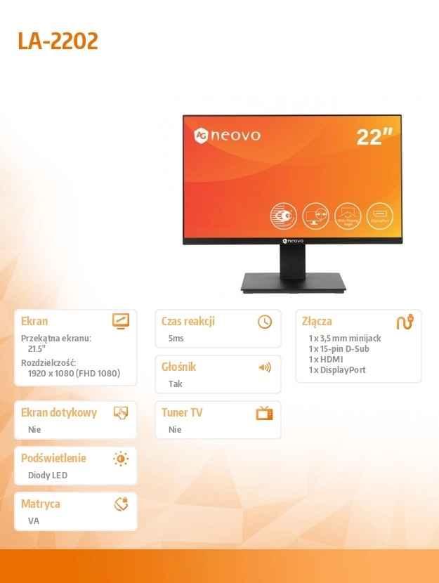 Uživajte u kvalitetnom prikazu na 22-inčnom monitoru s više mogućnosti povezivanja. Ovaj monitor je izvrsno rješenje za one koji traže pouzdanost i fleksibilnost.