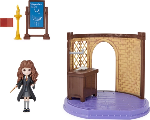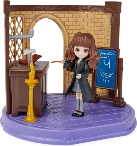 Uronite u svijet čarolija uz ovaj set za igru koji vas prenosi ravno u čarobnu učionicu. Namjestite Hermioninu ruku i promatrajte kako njezin štapić čini da se pero podigne iznad aktivacijske točke. Upravo tako, pero magično lebdi! Set također sadrži ploču, knjigu čarolija i svijeće, koje potiču kreativnu igru. Proživite omiljene scene iz Harryja Pottera u ovoj minijaturnoj verziji čarobnjačkog svijeta. Ovaj set moguće je kombinirati s drugim setovima poput Hogwarts Magical Minis i drugim tematskim setovima kako biste stvorili vlastiti čarobnjački svijet.