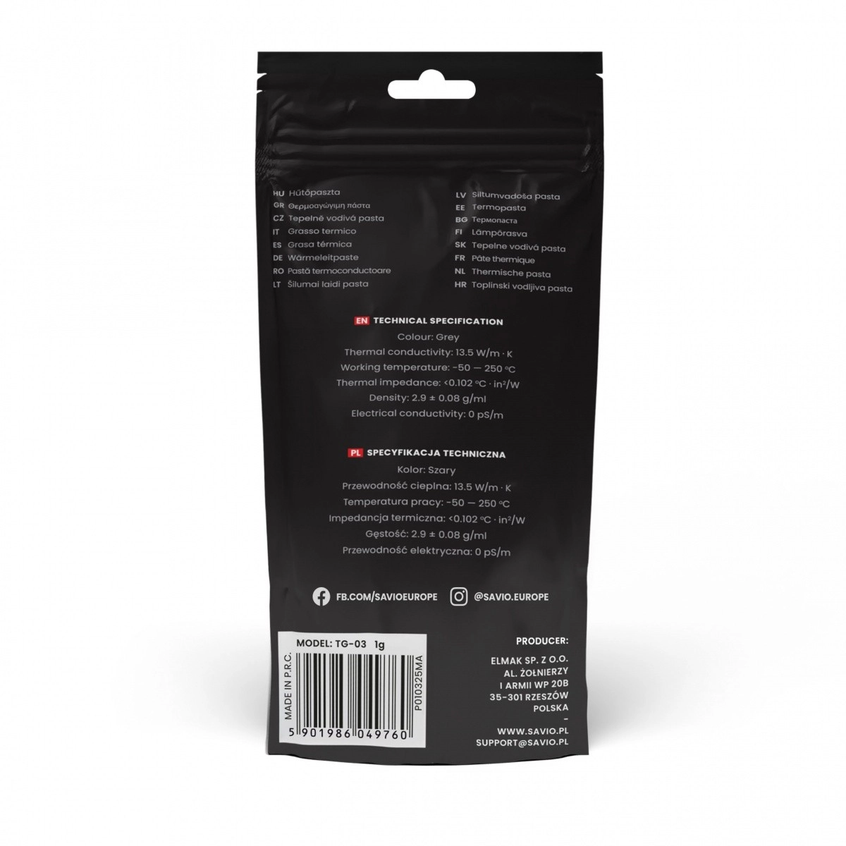 Termalna pasta Savio Glacier TG-03 dizajnirana je za poboljšanje prijenosa topline između procesora i hladnjaka. Zahvaljujući njezinoj konzistenciji, nanošenje je jednostavno, čak i za manje iskusne korisnike. Pasta popunjava mikroskopske praznine na površinama i osigurava visoku toplinsku vodljivost.