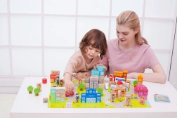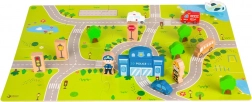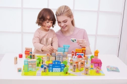Ovaj komplet omogućuje djeci izgradnju tipičnih gradskih zgrada poput škole, policijske postaje, vatrogasne stanice, aerodroma, bolnice, banke, restorana, trgovine za životinje i drugih. Igračka je izrađena od prirodnih, biorazgradivih i hipoalergenih materijala, što osigurava maksimalnu sigurnost.