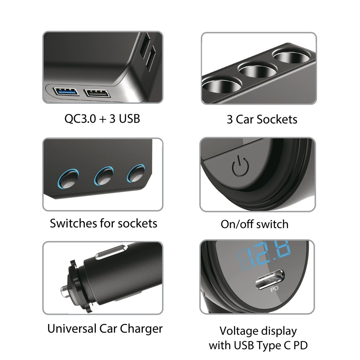 Ovaj razdjelni adapter idealan je za sve koji trebaju puniti više uređaja u isto vrijeme tijekom vožnje automobilom. Podržava ultra‑brzo punjenje putem standarda Qualcomm Quick Charge 3.0 i Power Delivery 18W USB‑C, što je idealno za moderne pametne telefone poput iPhone 8/8 Plus/X.