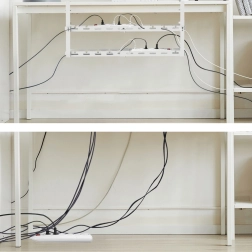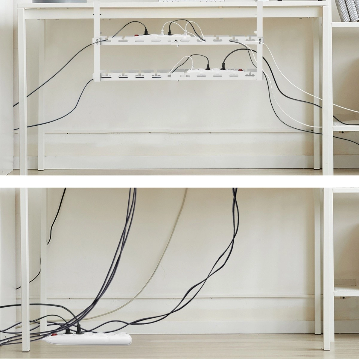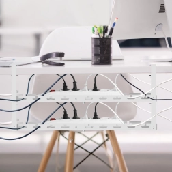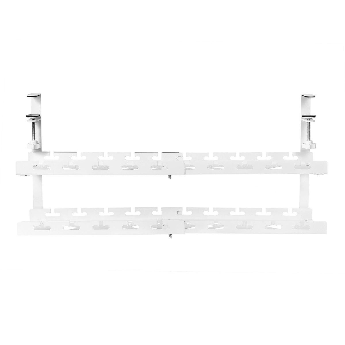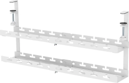 Podstolni organizator ima dva nivoa držača, što omogućuje istodobno učvršćivanje dviju razvodnih letvi ili dodatnih uređaja poput adaptera, USB čvorišta ili usmjerivača. Stezni montažni sustav omogućuje brzu i neinvazivnu ugradnju bez potrebe za bušenjem ili oštećivanjem površine namještaja.