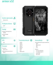 Količina baterije od 5500 mAh osigurava do 30 sati razgovora ili 300 sati u stanju mirovanja i podržava brzo 18W punjenje putem USB-C-a. Ulefone Armor X32 opremljen je visokokvalitetnim kamerama za precizno fotografiranje, uključujući 48 Mpx glavne, 20 Mpx noćne i 2 Mpx makro leće.