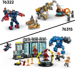 Doživite epsku bitku dobra i zla s ikoničnim junacima iz MARVEL svemira. Set donosi realistčnu akciju: zeleni Hammerov dron s opružnim bacačem, plavi dron s dvostrukim bacačima, minifiguricu IRON MAN s plavim blasterima i minifiguricu WAR MACHINE s crvenim blasterima i ramenim bacačem kockica.