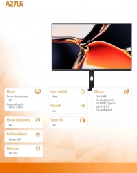 Zahvaljujući certifikaciji VESA DisplayHDR 400 možete uživati u boljoj dinamici svijetlih i tamnih scena. Priključak USB‑C s 65 W Power Delivery napaja prijenosno računalo i prenosi sliku jednim kabelom, dok 2× HDMI 2.1, DisplayPort 1.4 i integrirani USB čvorište olakšavaju povezivanje perifernih uređaja. Ergonomsko postolje omogućuje nagib, okretanje, pivot i podešavanje visine, kao i montažu na VESA 100 × 100 mm.