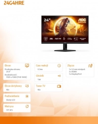AOC 24G4HRE je 23,8" gaming monitor koji kombinira 200 Hz stopu osvježavanja, Fast IPS tehnologiju i 1 ms GtG / 0,5 ms MPRT za savršeno glatku sliku u brzim scenama. HDR10 donosi žive boje i dublji kontrast, dok Adaptive Sync i G‑SYNC kompatibilnost eliminiraju trganje i zastajkivanje.