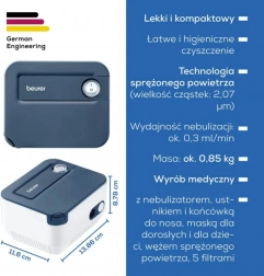 Uređaj je dizajniran za higijensku i udobnu uporabu – ima odvojive dijelove za jednostavno čišćenje i kompatibilan je sa svim lijekovima namijenjenim i odobrenim za inhalaciju (uvijek se ravnajte prema preporuci liječnika ili ljekarnika). Tehnologija stlačenog zraka (kompresorska) osigurava učinkovito raspršivanje i kraće vrijeme inhalacije zahvaljujući visokoj učinkovitosti nebulizacije.