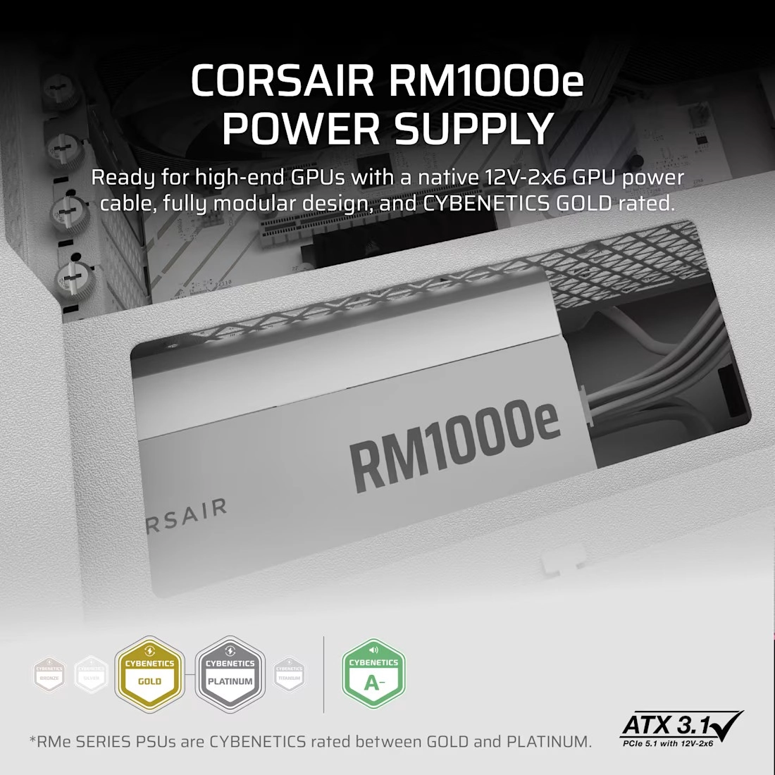 Corsair RM1000e White dizajniran je za zahtjevna gaming i radna računala, gdje su ključni stabilnost, tišina i učinkovitost. Zahvaljujući modernim standardima ATX 3.1 i PCIe 5.1 lako napaja snažne grafičke kartice i procesore, dok Cybenetics Gold certifikacija jamči visoku učinkovitost i kultiviran rad.