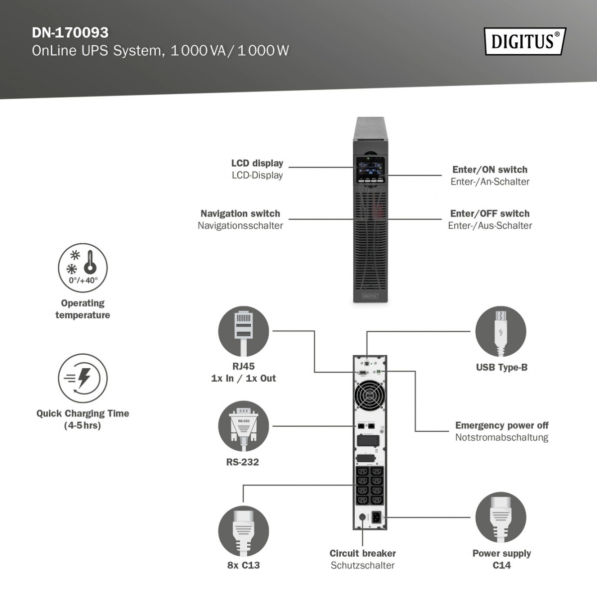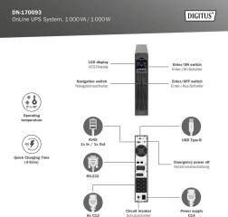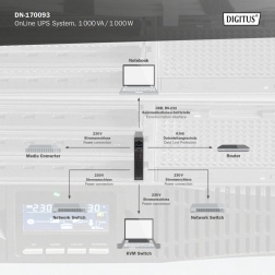 Profesionalni On-Line UPS od DIGITUS-a dizajniran je za neprekidnu zaštitu servera, mrežne opreme i radnih stanica. Dvostruka konverzija s mikroprocesorskim upravljanjem osigurava čisti sinusni val i stabilan napon bez preklapanja, štiteći tako podatke i hardver pri ispadima, preniskom ili previsokom naponu. Zahvaljujući visokom faktoru snage i snažnom punjaču prikladan je i za zahtjevna poslovna okruženja.