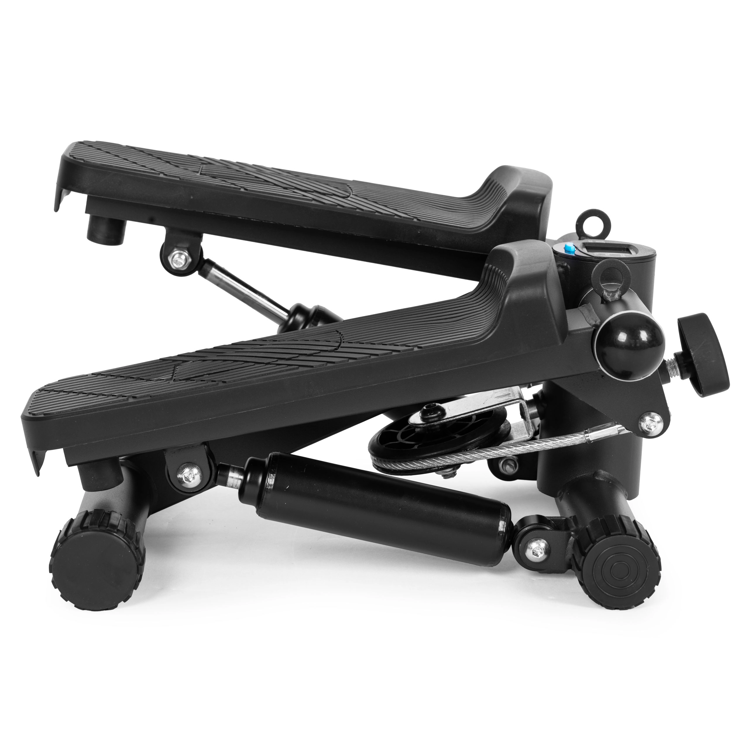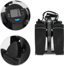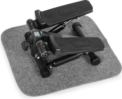 Integrirani LCD zaslon (5 funkcija) pregledno prikazuje vrijeme, korake/min, ukupan broj koraka, potrošene kalorije i način SCAN. Protuklizne pedale i stabilizacijske nožice osiguravaju sigurnost i udobnost. Zaštitna podloga od vunenog filca prigušuje vibracije, štiti pod i sprječava pomicanje uređaja i u manjim prostorima.