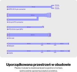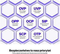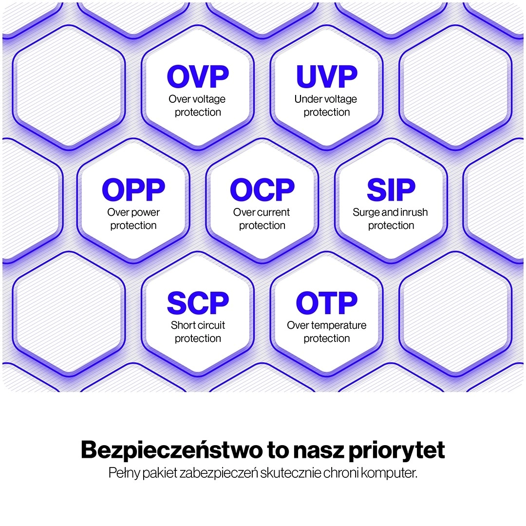 Upotrijebljeni japanski kondenzatori (105 °C) jamče stabilnost u zahtjevnim uvjetima. Potpuno modularno kabliranje pojednostavljuje upravljanje kabelima, poboljšava protok zraka i snižava temperature. Paket električnih i toplinskih zaštita štiti vaše računalo od preopterećenja, prenapona, kratkog spoja i pregrijavanja. Kvalitetu prati i jamstvo od 10 godina.