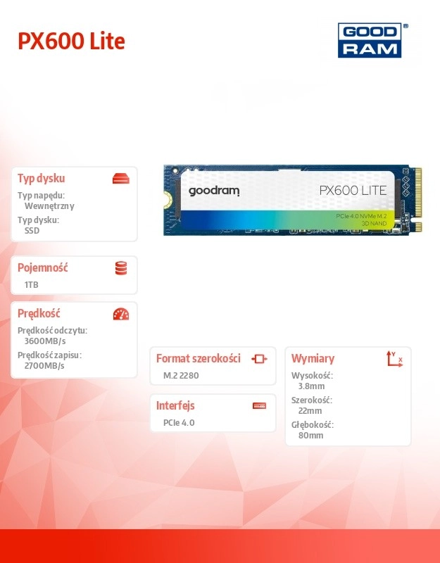 Nadogradite performanse svog računala s SSD-om PX600 Lite. Zahvaljujući sučelju PCIe Gen4 x4 i protokolu NVMe dobit ćete brzo pokretanje sustava, munjevito učitavanje aplikacija i glatko kopiranje velikih datoteka. Kapacitet 1 TB odličan je za operativni sustav, igre i multimedijske biblioteke.
