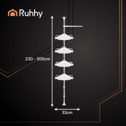 Četiri prostrane police omogućuju pregledno organizirati gelove za tuširanje, šampone i spužvice. Praktične kuke i držač za ručnik štede prostor i drže sve nadohvat ruke. Protuklizni završeci stupa povećavaju stabilnost na glatkim površinama, dok kombinacija nehrđajućeg čelika i izdržljivih plastika jamči dug vijek trajanja.