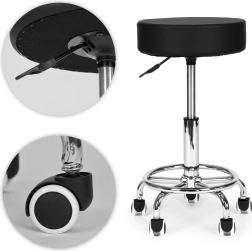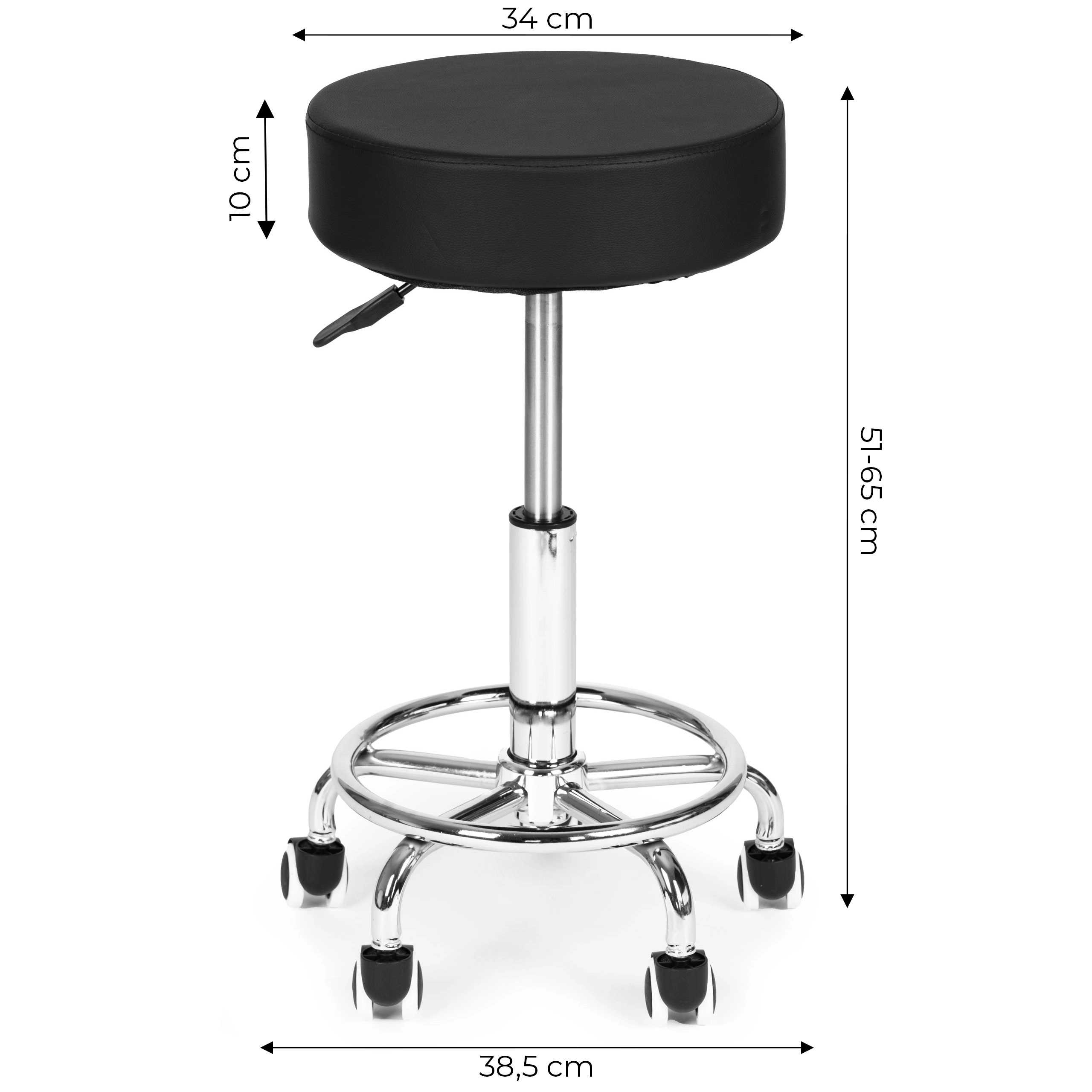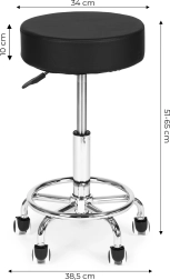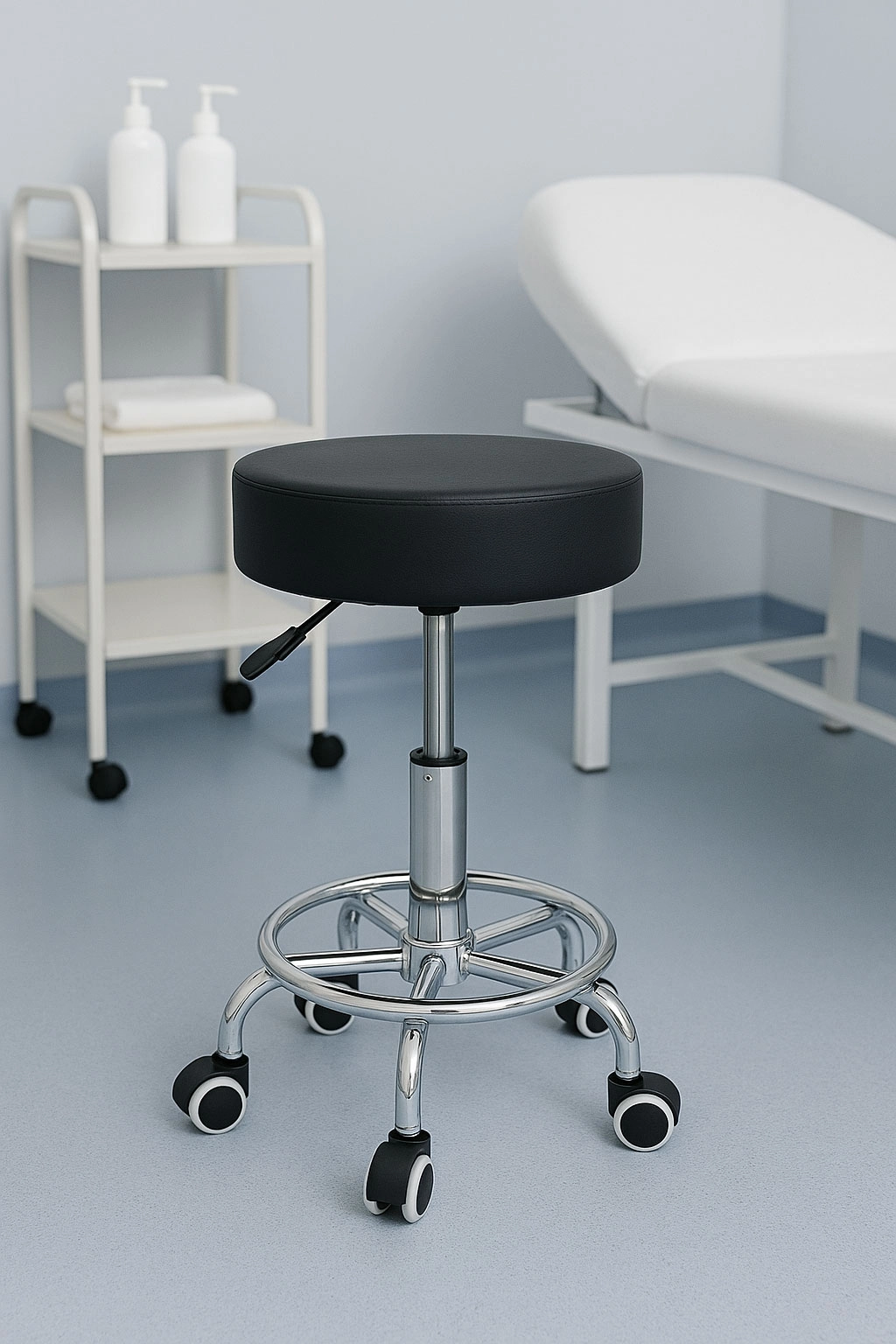 Izdržljiva izrada i jednostavno održavanje – presvlaka od PVC kože jednostavna je za čišćenje i otporna na vodu, masažna ulja i dezinfekcijska sredstva. Metalna (kromirana) konstrukcija sa širokom petokrakom bazom na kotačićima jamči stabilnost i glatko kretanje po većini podova bez ogrebotina.