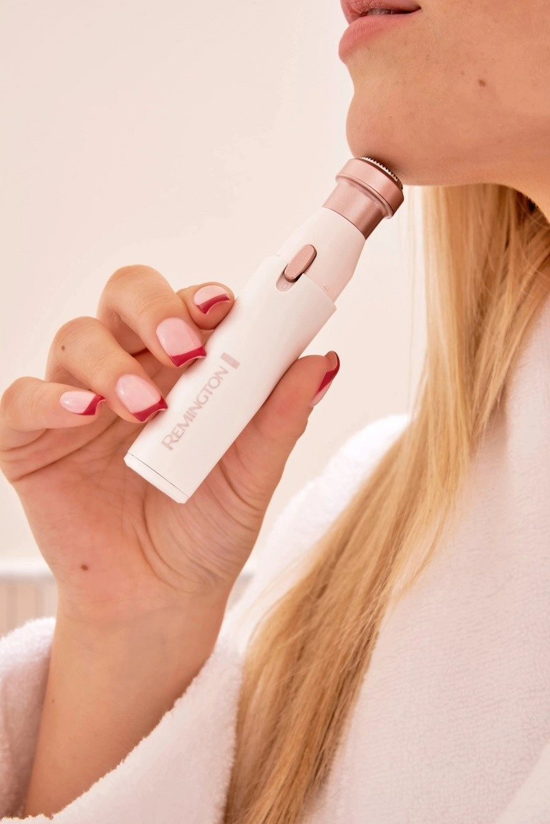Priuštite si glatku i blistavu kožu bez boli i iritacija. REMINGTON BareMe 2-u-1 kombinira nježnu brijaću glavu za lice, koja ujedno lagano eksfolira, te precizni trimer za obrve s bijelim LED prstenom za maksimalnu preglednost. Zahvaljujući hipoalergenim nastavcima nježan je prema koži i predstavlja odličnu alternativu dermaplaningu ili voskanju.