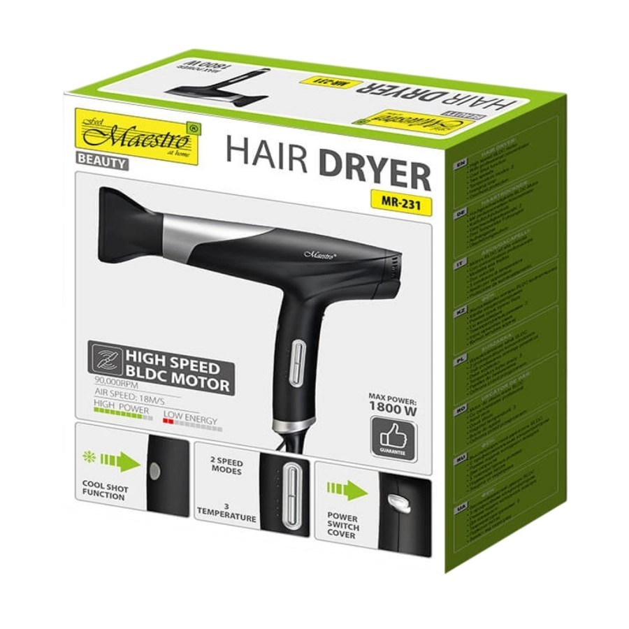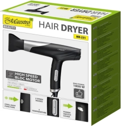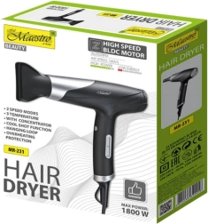 MAESTRO MR-231 je pouzdano sušilo dizajnirano za učinkovitu svakodnevnu njegu kose. Snažna snaga od 1800 W u kombinaciji s BLDC motorom od 90 000 okr./min osigurava brze rezultate čak i kod guste i duge kose. Brzina protoka zraka 18 m/s skraćuje vrijeme sušenja i pomaže zaštititi kosu od pretjerane topline.