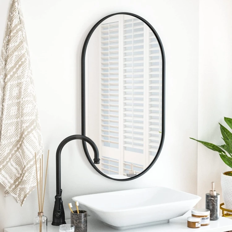 Svestrano ovalno ogledalo je funkcionalan i dekorativan element koji osvjetljava prostor i daje mu eleganciju. Velika reflektirajuća površina idealna je za provjeru odjevnih kombinacija, šminkanje ili stilizirano uređenje interijera. Tanki crni aluminijski okvir naglašava minimalistički i moderan izgled koji se lako usklađuje s raznim stilovima uređenja.