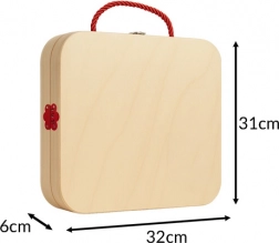 Sve su komponente pažljivo zaglađene i obojene netoksičnim bojama. Zahvaljujući koferu od šperploče s metalnim zatvaranjem i užetnom ručkom sve imate pregledno posloženo i spremno za put. Set je idealan poklon za dječake i djevojčice te je u skladu s europskim normama.