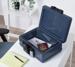 Kutija pruža do 30 minuta certificirane zaštite od požara i 72 sata vodonepropusne zaštite pri poplavama ili curenju vode. Integrirana transportna ručka olakšava nošenje, a praktičan format stane u ormar, ladicu ili na policu.