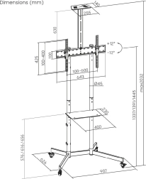 Dio kompleta je visinski podesiva središnja polica za reproduktore, konzole ili set-top boxeve (nosivost 5 kg) te gornja polica za kameru – savršeno za videokonferencije i prezentacije. Kotačići s kočnicom omogućuju fluidno premještanje između prostorija i sigurno fiksiranje na mjestu.