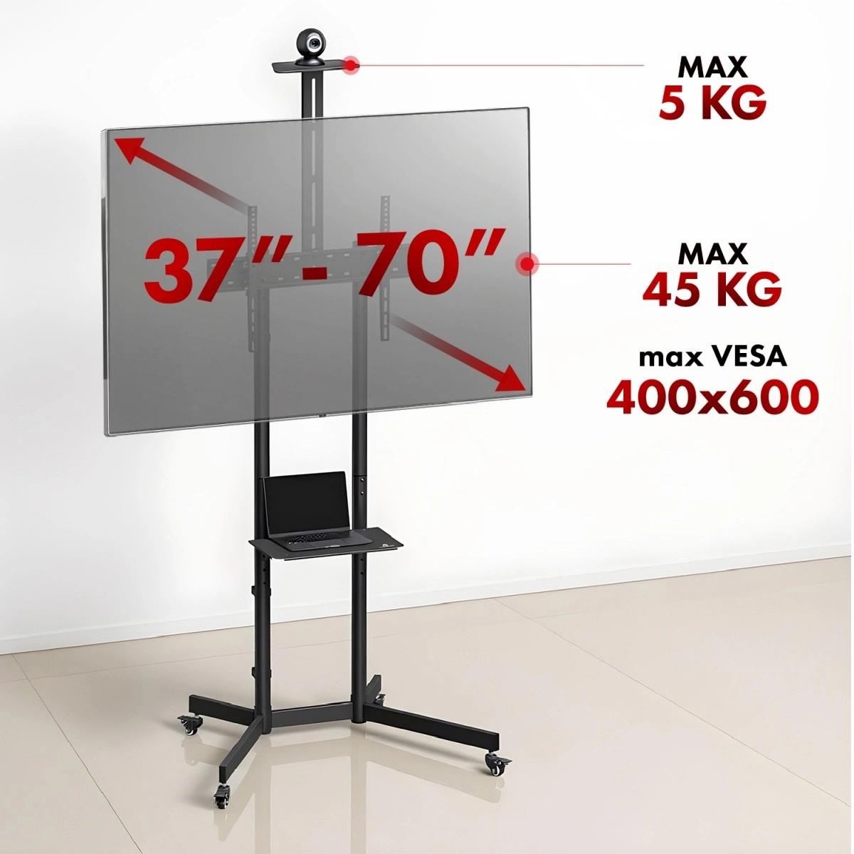 Mobilni TV stalak idealan je za sobe za sastanke, učionice i kućnu upotrebu. Stabilna čelična konstrukcija osigurava sigurno pričvršćivanje većine modernih televizora do mase 45 kg. Zahvaljujući širokoj kompatibilnosti s VESA (100×100 do 600×400) lako pričvrstite zaslone brojnih marki poput Sony, LG, Samsung ili Philips.