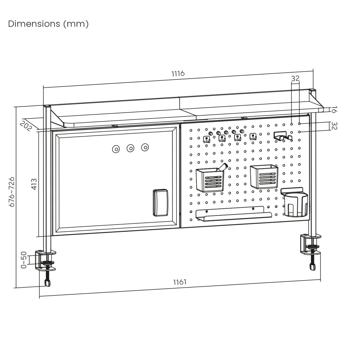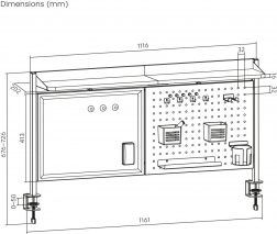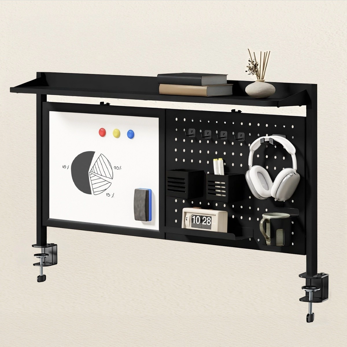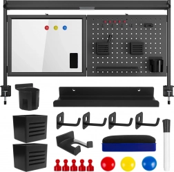 Ova višenamjenska nadogradnja pretvara svaki stol u preglednu i učinkovitu radnu zonu. Stabilno pričvršćivanje pomoću metalnih C–stezaljki štedi prostor i ne zahtijeva bušenje. Magnetska suho brisiva ploča idealna je za brze bilješke, zadatke ili ideje koje lako obrišete priloženom spužvicom, a perforirani panel omogućuje slobodno premještanje držača i košarica prema vašim potrebama.
