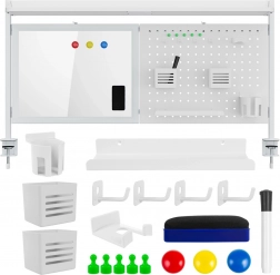 U kompletu je marker s spužvicom za brisanje, 5 magnetskih pribadača, 3 magneta, 4 kuke, 2 čašice za olovke, držač za čašu i polica.