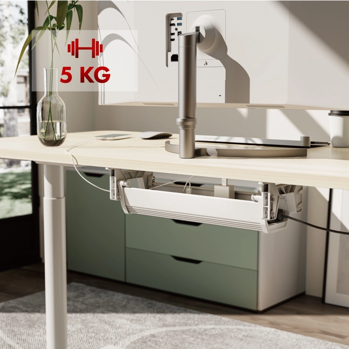 Organizator omogućuje ugradnju u dva visinska položaja radi prilagodbe prostoru i opremi. Brz pristup osigurava praktičan sustav otvaranja bez potrebe za demontažom. Neutralan dizajn u bijeloj/sivoj boji diskretno se uklapa u većinu stolova i interijera.