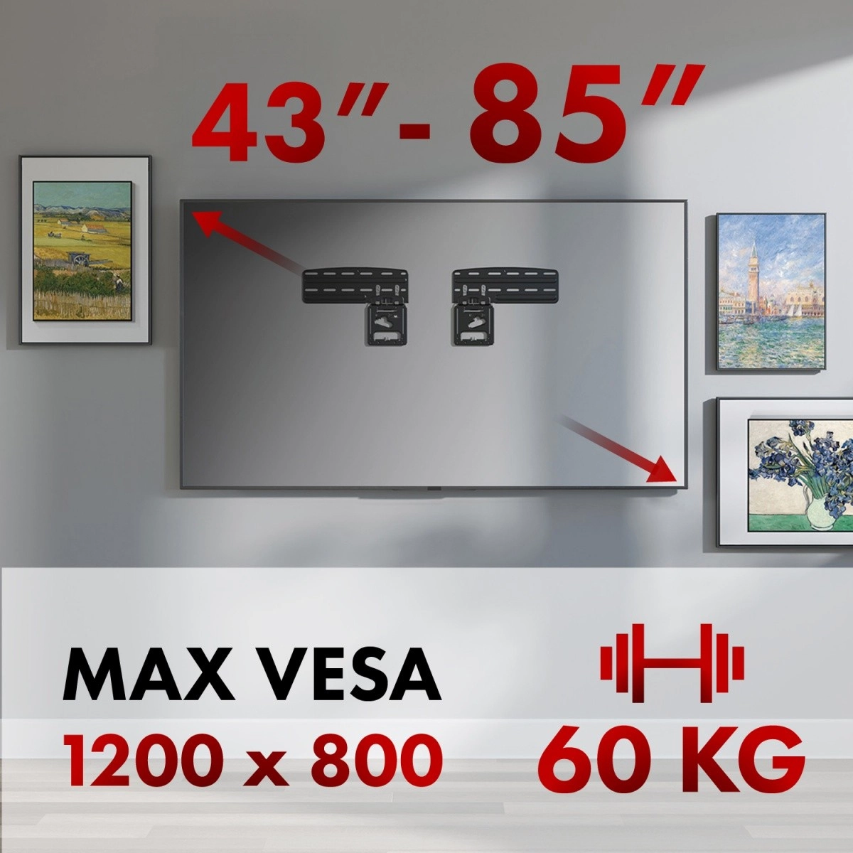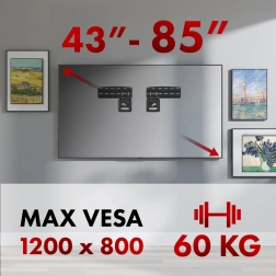 Robusna metalna konstrukcija s nosivošću 60 kg jamči dugotrajnu stabilnost i kod velikih dijagonala 43–85". Promišljen montažni sustav s preciznim šablonama i setom vijaka olakšava instalaciju te omogućuje sigurno pričvršćivanje na različite tipove zidova.