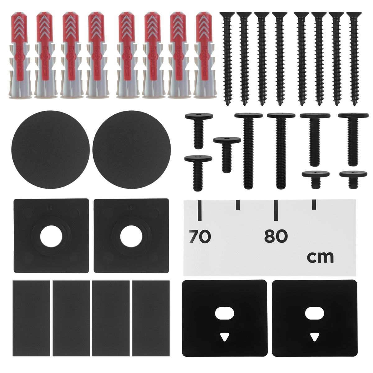 U pakiranju se nalaze vijci, tiple, podloške i instalacijska šablona za brzu i preciznu montažu na zid.