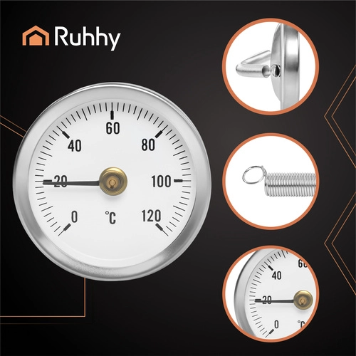 RUHHY bimetalni termometar za cijev spaja jednostavnost, preciznost i izdržljivost. Zahvaljujući jasnoj skali brzo ćete očitati trenutačnu temperaturu plinova ili tekućina koje protječu kroz cjevovod. Pričvršćivanje je jednostavno – termometar lako učvrstite opružicom izravno na cijev, što ga čini idealnim alatom za grijne sustave, industrijska postrojenja i kućnu upotrebu.