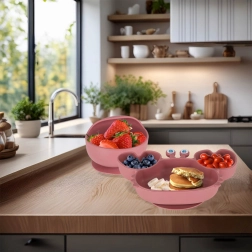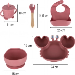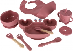 Ovaj set od 9 dijelova u elegantnoj tamnoružičastoj boji sadrži sve potrebno za udobno i sigurno hranjenje djeteta od 6 mjeseci. Tanjur u obliku raka s pregradama i zdjelica s učinkovitim vakuumskim podlogama čvrsto stoje na stolu ili dječjoj hranilici, čime se smanjuju prolijevanja i nered. Mekani silikon za prehranu bez BPA nježan je za desni i zubiće te se lako čisti.