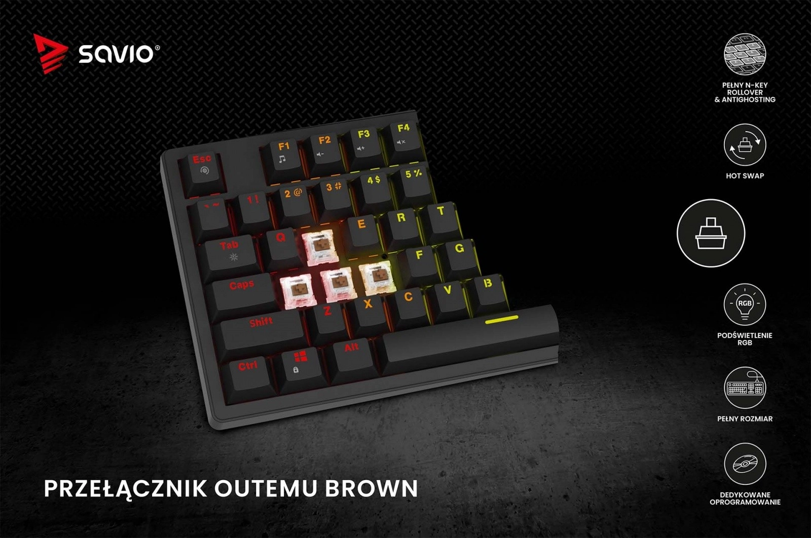 Savio Styx kombinira izdržljivu konstrukciju, pouzdane performanse i moderne funkcije u punom rasporedu s numeričkim blokom. Taktični prekidači OUTEMU BROWN nude uravnotežen otpor, blagi haptički trenutak i tiši rad – idealno za igranje i dugo tipkanje. Zahvaljujući hot-swap ležištima tipkovnicu lako prilagodite svojim preferencijama bez lemljenja.