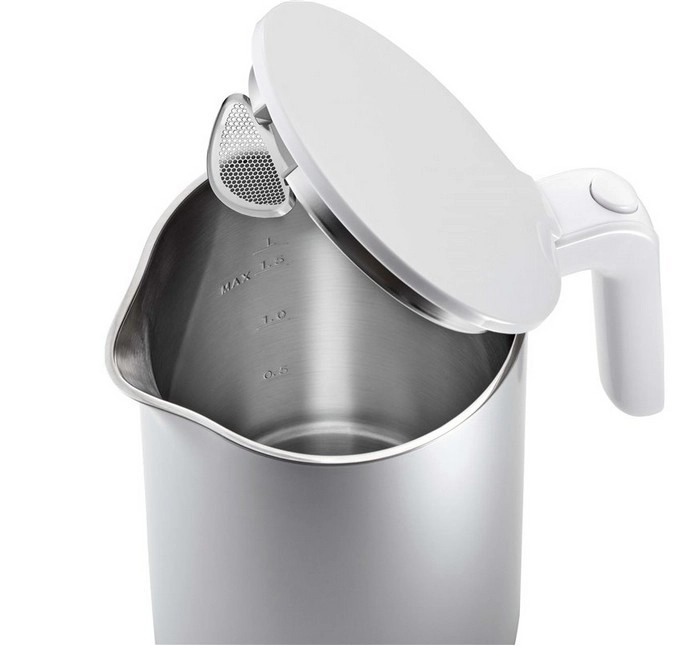 Bešavna posuda od nehrđajućeg čelika s unutarnjim oznakama do 1,5 l i finim čeličnim filtrom u izljevnoj cijevi osigurava čisto točenje i bolji okus vode.